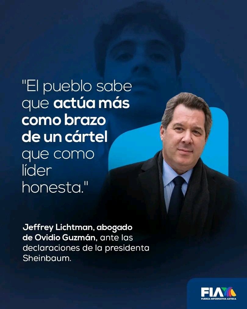 • El abogado de Ovidio Guzmán, de nombre Jeffrey Lichtman, declaró que Claudia Sheinbaum, es publirrelacionista del Cártel de Sinaloa, hecho que genero consternación en la sociedad mexicana por venir de quien defiende a uno de los integrantes de las familias más poderosas del mundo del narcotráfico.