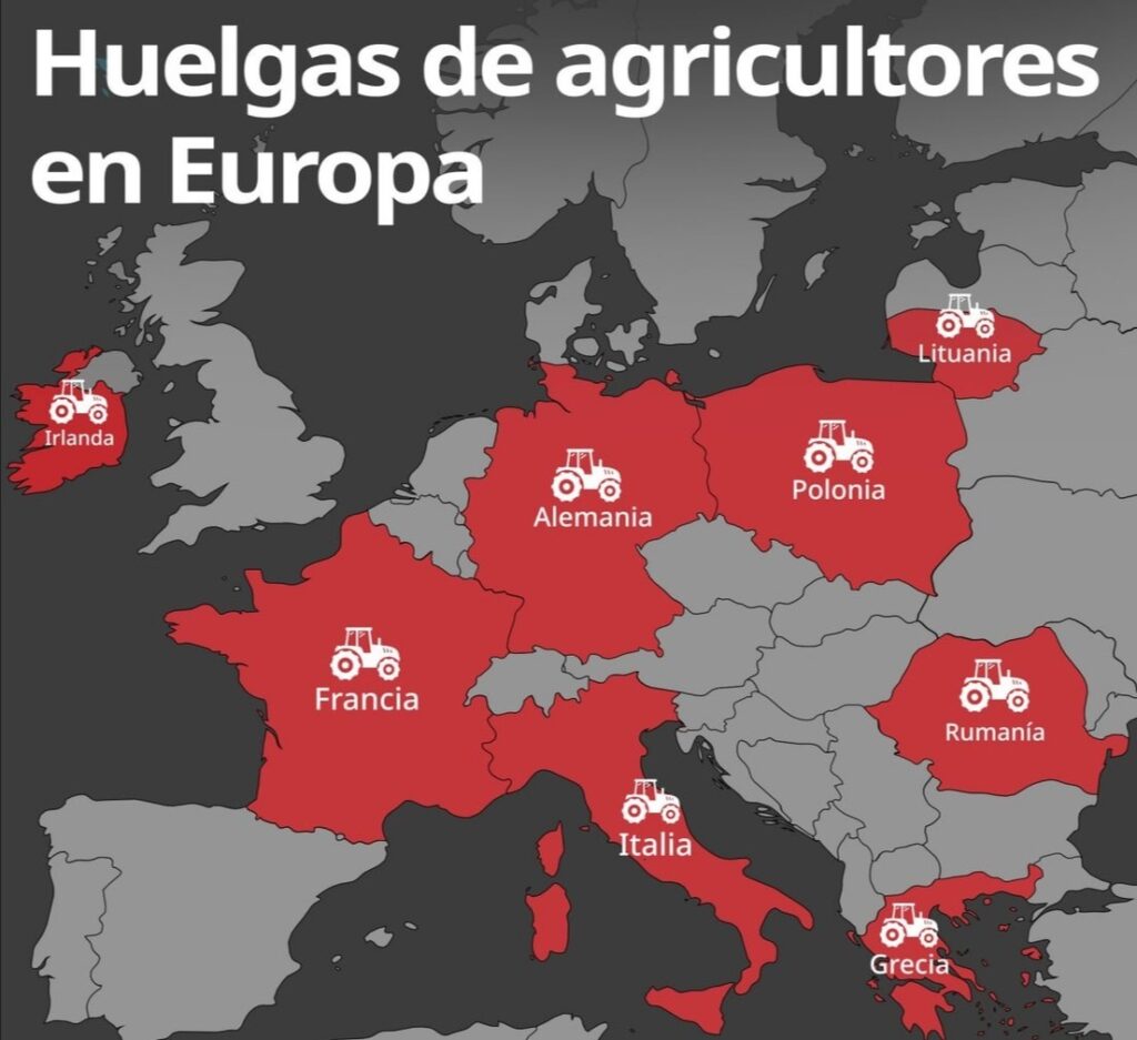Varios países de la UE se han visto sacudidos este Enero del 2024 por manifestaciones de granjeros, que protestan contra el Pacto Verde Europeo, las subidas de los impuestos sobre el diésel y las competencias de las importaciones de los productos agrícolas ucranianos, en medio de una crisis económica acompañada por una alta inflación y discrepancias políticas entre los funcionarios del bloque ante las elecciones europeas, programadas para junio.