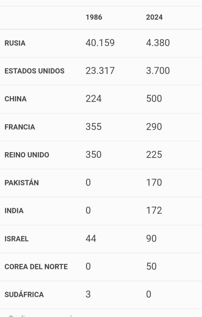 Bajón nuclear. Tras una carrera armamentística que iba paralela a la espacial, tanto la URSS como Estados Unidos vieron cómo su arsenal nuclear iba menguando hasta, a mediados de los 2000, estabilizarse. La situación en 2024 es muy distinta a la de hace 40 años, y los países que en 1986 encabezaban la lista de potencias nucleares han ido reduciendo su arsenal. Incluso llegando a perderlo por completo, como Sudáfrica.